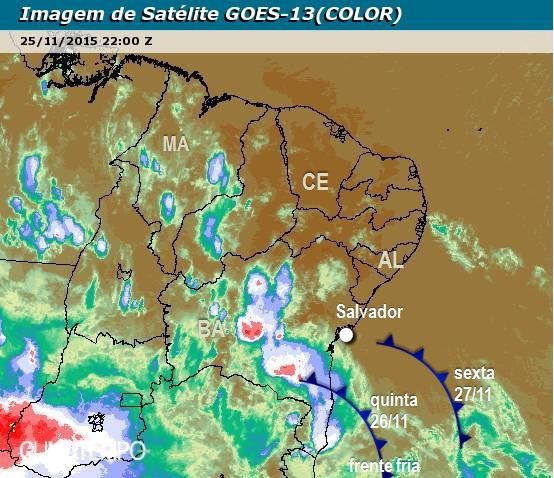 A frente fria que avança pelo litoral da Bahia vai ajudar a concentrar a umidade para formar nuvens de chuva sobre a região de Salvador, mas novembro deve terminar ainda com chuva muito abaixo da média.