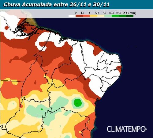 A falta de chuva é generalizada sobre o Nordeste. Apenas esta semana ocorreram algumas fortes pancadas de chuva no sul do Maranhão e do Piauí. Alvorada do Gurgéia, no Piauí, acumulou 45 mm de chuva nesta quarta-feira em apenas 2 horas.