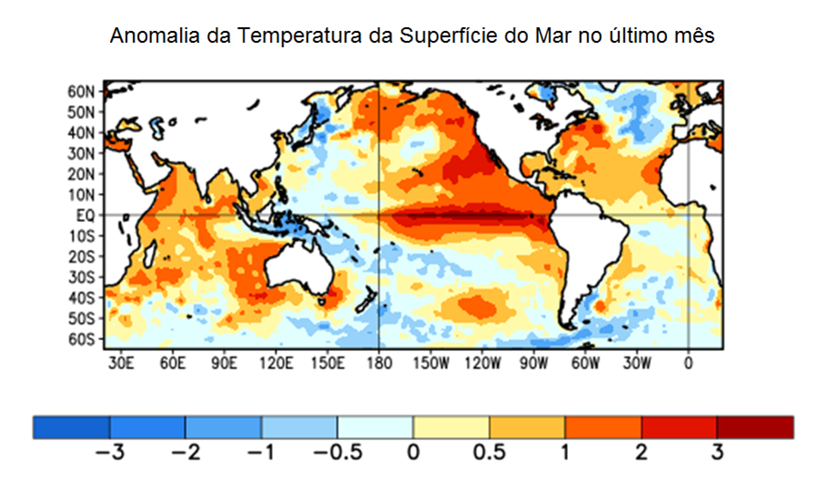 O mapa mostra a situação da anomalia da água do mar no Pacífico com El Niño (forte mancha vermelha) e do Atlântico Sul que está numa situação muito diferente dos últimos dois verões.