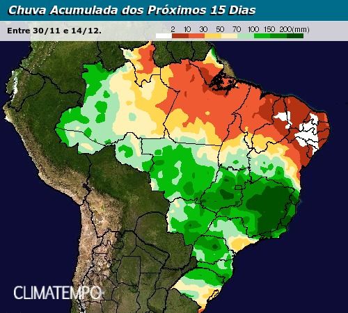 Sobre a Região Sul são esperados esses grandes volumes acumulados de chuva, principalmente pela presença do fenômeno climático El Niño que favorece a persistência dos sistemas que provocam chuva nesta área. As frentes frias também vão conseguir avançar para o Sudeste e por este motivo é possível ver que áreas como Minas Gerais, Rio De Janeiro e Espírito Santo terão volumes acumulados que podem chegar aos 150mm ao longo da primeira quinzena do mês de dezembro.
