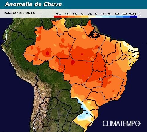 A chuva de dezembro já supera a média em algumas áreas da Região Sul e do sul de Mato Grosso do Sul, mas de forma geral ainda está muito abaixo da média normal em praticamente todo o Brasil.