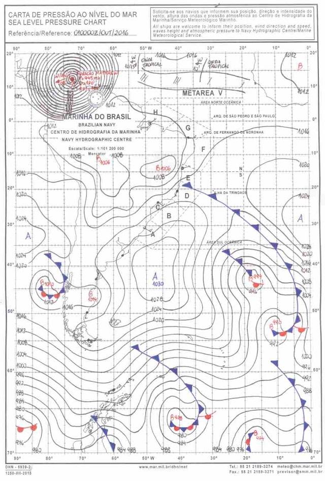 O furacão Matthew está passando bastante próximo do extremo norte da América do Sul, o que não é muito comum. As cartas meteorológicas da América do Sul mostram a presença deste poderoso furacão. Veja como Matthew aparece na carta sinótica da Marinha do Brasil de 30 de setembro de 2016, às 21 horas (Brasília)