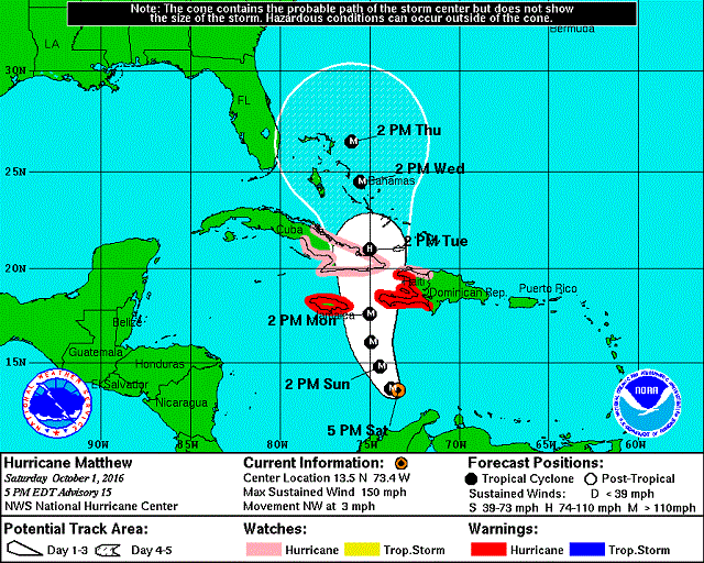 A projeção de deslocamento indica que Matthew passará sobre a Jamaica (atingindo também o Haiti) na segunda-feira, 3, no sul de Cuba na terça e sobre as Bahamas na quarta-feira, 5 de outubro. O furacão deve enfraquecer ao passar sobre o sul de Cuba, mas a previsão é que se fortaleça novamente e atinja Bahamas como um furacão "major", com ventos acima de 177 km/h.