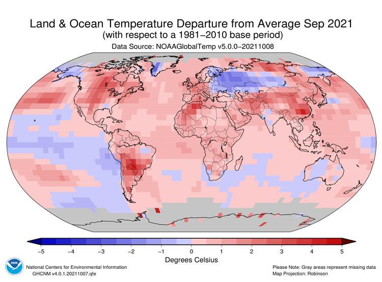 Segundo dados recentes divulgados pela NOAA (Centro de monitoramento climático norte-americano), a temperatura global da superfície em setembro de 2021 foi 0,90°C acima da média do século XX (onde a temperatura média global é 15,0°C) e foi a 5ª temperatura mais alta em setembro no recorde de 142 anos, atrás apenas de setembro de 2015, 2016, 2019 e 2020. Os oito setembros mais quentes ocorreram desde 2014. O mês de setembro de 2021 também marcou o 45º setembro consecutivo e o 441º mês consecutivo com temperaturas acima da média do século XX.