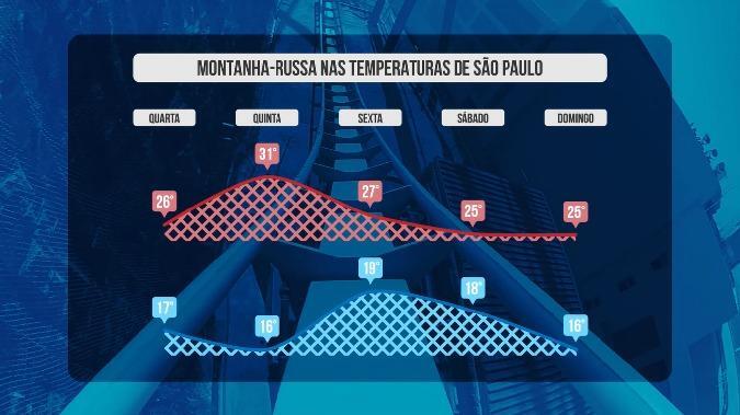 A capital paulista vai passar por dias de grande oscilação nas temperaturas. As máximas e mínimas vão ter um efeito "sobe e desce" ao longo dos próximos dias e, por isso, chamamos de gangorra.