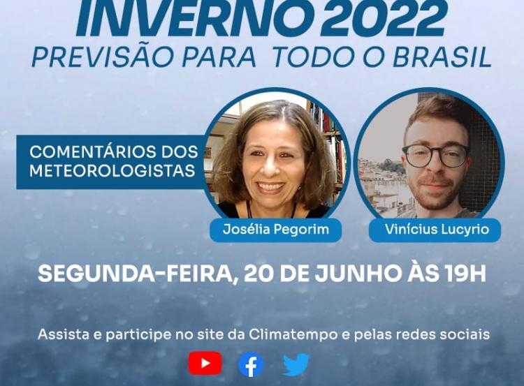 Os meteorologistas Josélia Pegorim e Vinícius Lucyrio comentam os principais aspectos do inverno de 2022 no Brasil, de acordo com a previsão elaborada pela Climatempo, ao vivo, pelo site e pelas redes sociais.